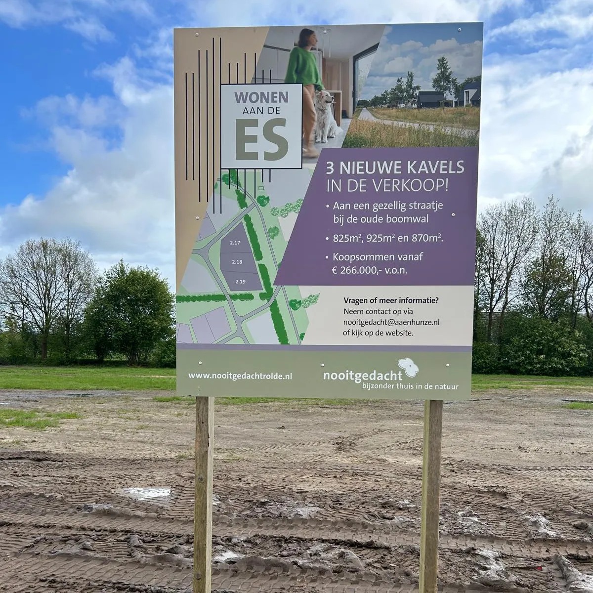 Bij deze drie kavels staat nu een bouwbord. Ook zijn de werkzaamheden voor het bouwrijp maken van de grond in volle gang, zodat er binnenkort gestart kan worden met bouwen.